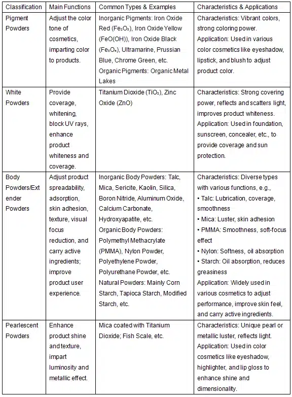Inorganic powders are diverse. Structurally, they are classified into metal and alloy powders, oxide and hydroxide pigments, and other inorganic materials. Based on appearance and characteristics, they fall into colored powders, white powders, extender powders, and pearlescent powders. By functional properties, they can be categorized as colorants, extenders, and sunscreen agents.