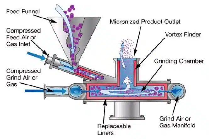 Material is accelerated through a jet feeder nozzle and introduced into the grinding chamber. Driven by a rotating airflow, particles undergo mutual collision, friction, and shear, resulting in pulverization.
