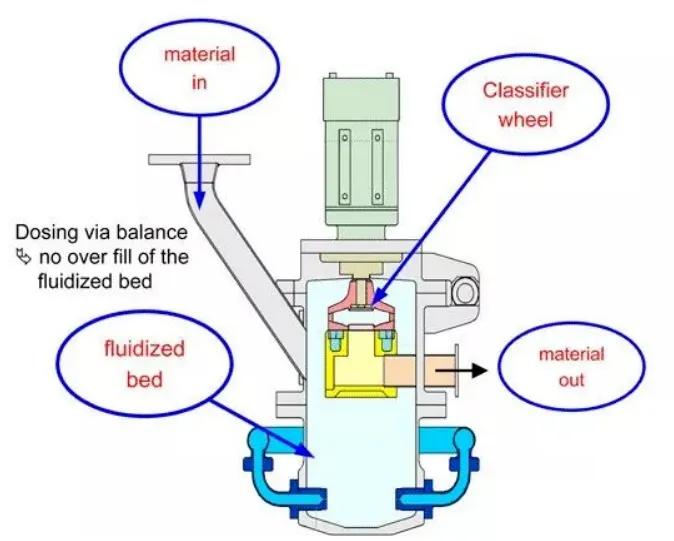 The integration of fluidized bed technology and a horizontal turbine classifier enables rapid removal of fine particles, reducing over-grinding.