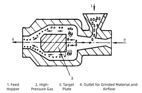 Material is accelerated through the feeding inlet by the nozzle of a jet feeder and introduced into the grinding chamber. Driven by a rotating airflow, particles undergo mutual collision, friction, and shear, resulting in size reduction.
