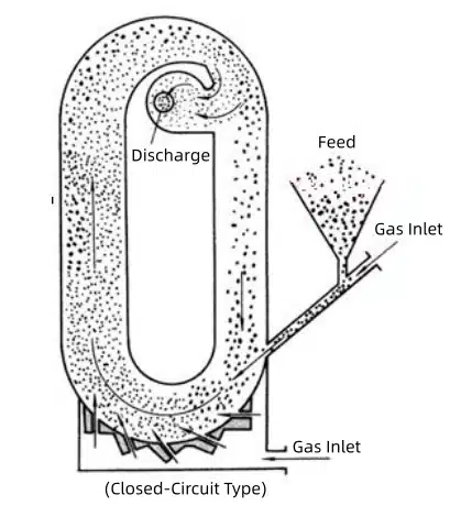 The circulating pipe jet mill, also known as a vertical annular jet mill, also features internal classification. It can be divided into constant cross-section and variable cross-section designs. The most widely used type is the JOM (O-type) variable cross-section circulating pipe jet mill.